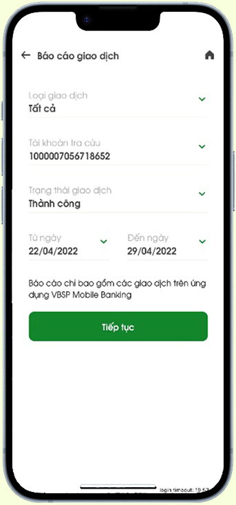 Chọn các tiêu chí tìm kiếm: Chọn loại giao dịch, chọn tài khoản, chọn khoảng thời gian tìm kiếm. Sau đó nhấn Tiếp tục