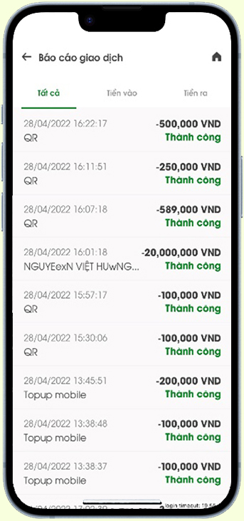 Màn hình kết quả hiển thị Tab Tất cả, Tiền vào, Tiền ra.