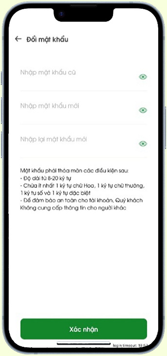 Nhập vào Mật khẩu cũ, đặt Mật khẩu mới, Xác nhận mật khẩu mới