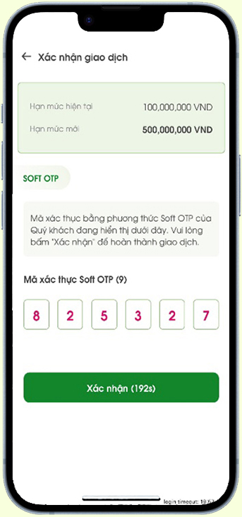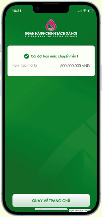 Màn hình xác nhận cài đặt hạn mức chuyển tiền thành công