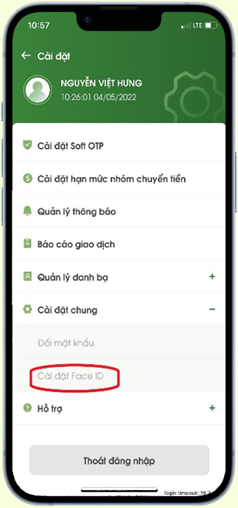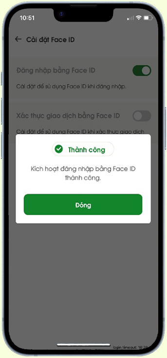 KH đã có thể đăng nhập ứng dụng bằng face ID đã cài trên thiết bị.