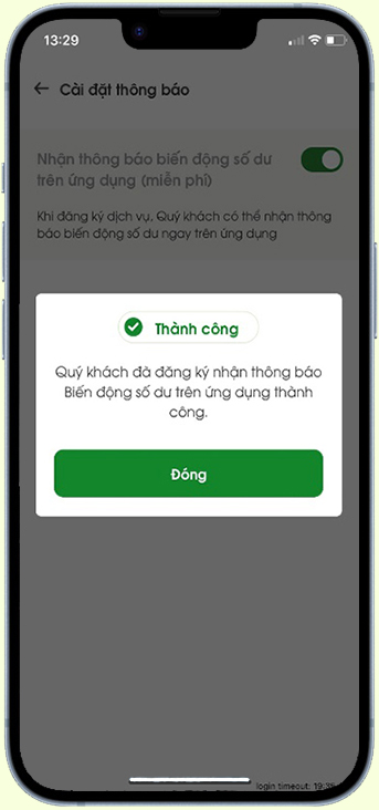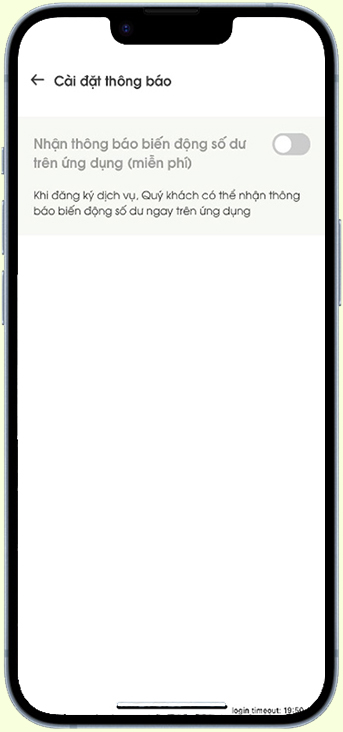 Chọn Nhận thông báo biến động số dư trên ứng dụng bằng cách gạt nút toggle