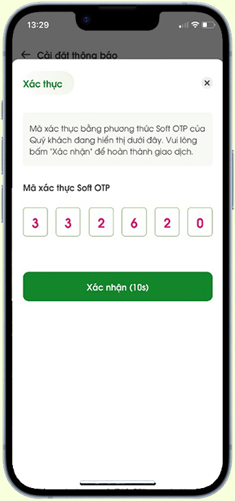 Nhập mã xác thực (mã Soft OTP hoặc SMS OTP), sau đó nhấn xác nhận để xác thực kích hoạt