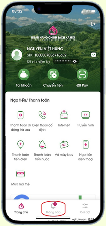 Tại màn hình Trang chủ -> chọn icon Thông báo