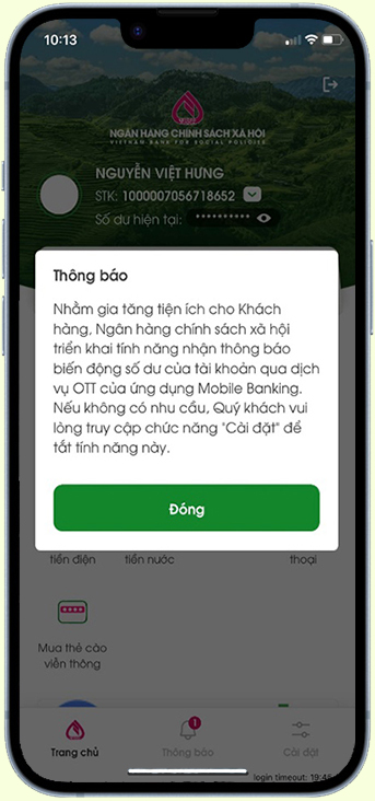 đăng nhập ứng dụng sẽ tự động kích hoạt chức năng nhận OTT biến động số dư cho khách hàng đó.