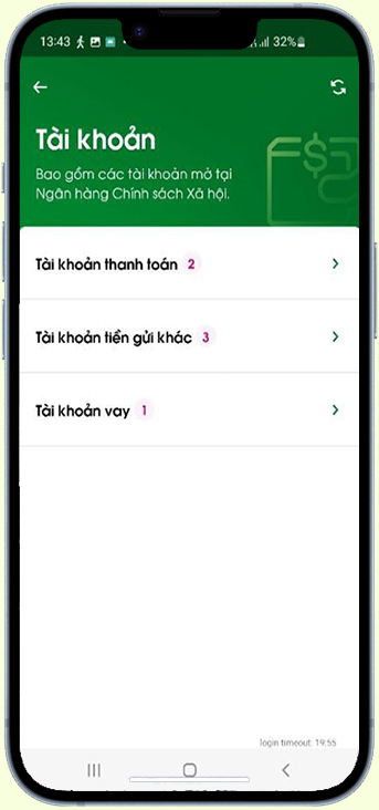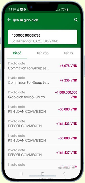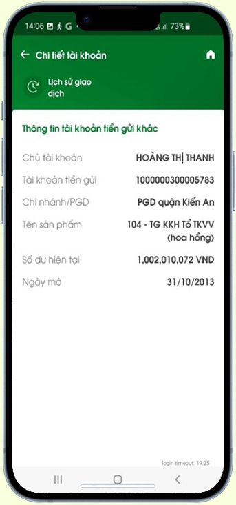 App hiển thị toàn bộ lịch sử giao dịch trong vòng 7 ngày của tài khoản tiền gửi khác. Trường hợp muốn tìm