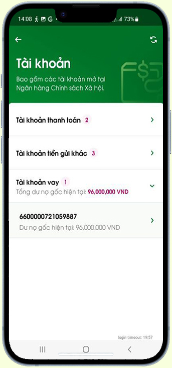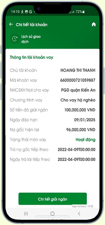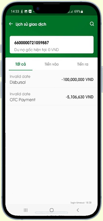 App hiển thị toàn bộ lịch sử giao dịch trong vòng 7 ngày của tài khoản vay. Trường hợp muốn tìm kiếm lịch