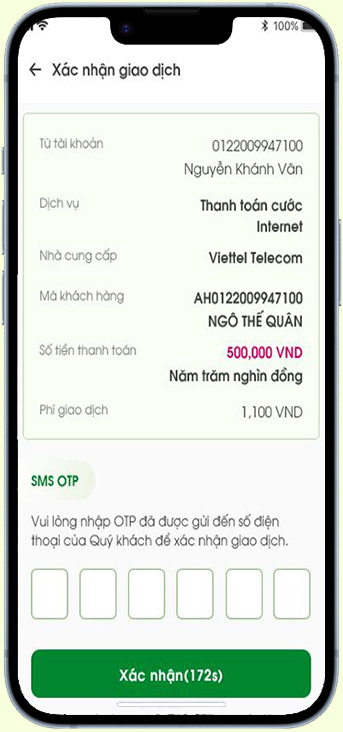 Xác thực bằng SMS OTP: nhập mã OTP được gửi về số điện thoại của khách hàng