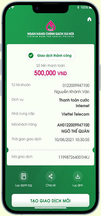 : chỉa sẻ ảnh kết quả giao dịch đến các ứng dụng được phép chia sẻ đã được cài đặt trên thiết bị của khách hàng