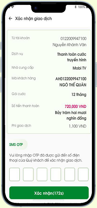 Xác thực bằng SMS OTP: nhập mã OTP được gửi về số điện thoại của khách hàng