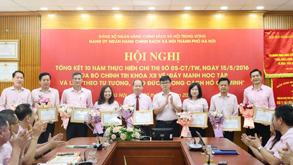 Tại hội nghị, Đảng ủy NHCSXH thành phố Hà Nội cũng đã công bố quyết định tặng Giấy khen cho 5 tập thể và 10 cá nhân có thành tích xuất sắc trong thực hiện Chỉ thị 05/CT-TW Khóa XII ngày 15/5/2016 của Bộ Chính trị về “Đẩy mạnh học tập và làm theo tư tưởng, đạo đức, phong cách Hồ Chí Minh” giai đoạn 2016 - 2025.