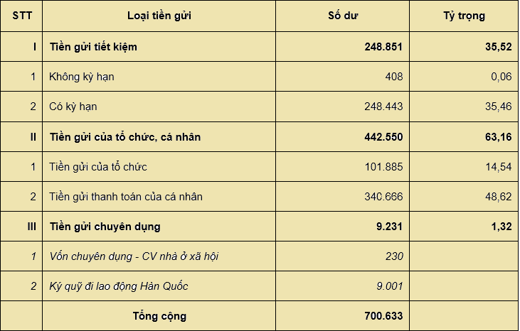 - Số dư tiền gửi của tổ chức, cá nhân 442.550 triệu đồng, chiếm 63,16% tổng nguồn vốn huy động. Trong đó, tiền gửi của tổ chức số dư đạt 101.885 triệu đồng, chiếm 14,45% trên tổng số dư nguồn huy động; tiền gửi không kỳ hạn của khách hàng cá nhân khác bao gồm tiền gửi của Tổ trưởng tổ tiết kiệm và vay vốn, nhận tiền gửi của tổ viên tổ tiết kiệm và vay vốn, tiền gửi của các cá nhân khác mở tài khoản thanh toán, số dư đạt 340.666 triệu đồng, chiếm 48,62% trên tổng số dư nguồn huy động.
