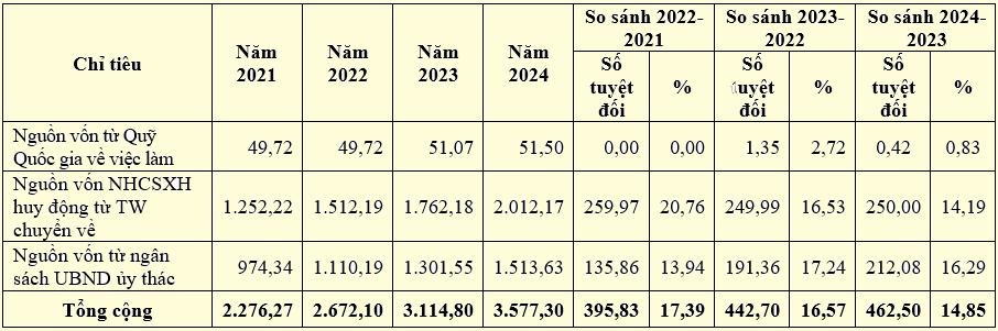 - Về nguồn vốn cho vay, tổng nguồn vốn tăng mạnh từ 2.276 tỷ đồng năm 2021 lên 3.577 tỷ đồng năm 2024, tốc độ tăng trưởng bình quân đạt trên 16%/năm. Dù tốc độ tăng hàng năm có xu hướng giảm nhẹ, nhưng vẫn cho thấy nỗ lực lớn trong việc mở rộng quy mô tiếp cận vốn.