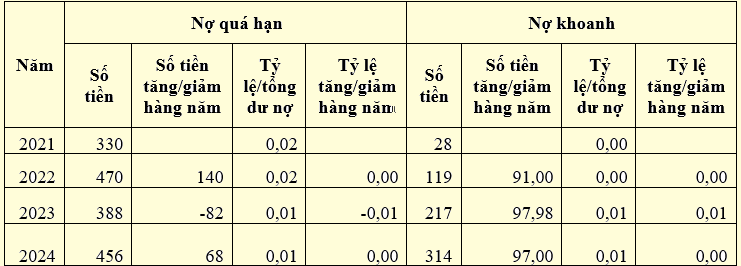 Bảng 3. Tình hình nợ quá hạn, nợ khoanh chương trình cho vay hỗ trợ tạo việc làm, duy trì và mở rộng việc làm giai đoạn 2021-2024