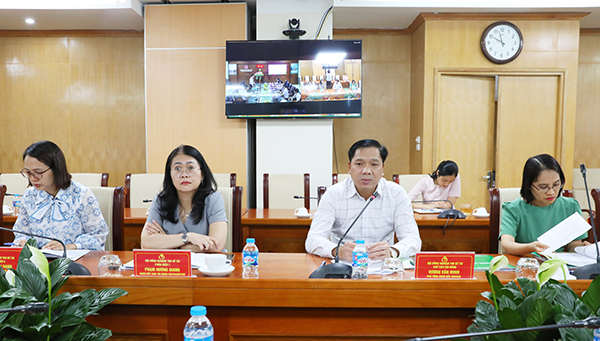 Phó Tổng Giám đốc Vương Văn Minh - Chủ tịch Hội đồng nghiệm thu NHCSXH chủ trì tại điểm cầu trực tuyến Hội sở chính