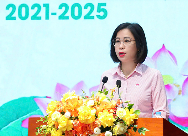 Đồng chí Lê Thị Đức Hạnh, Phó Bí thư Đảng ủy NHCSXHTW - Phó Tổng Giám đốc trình bày báo cáo Báo cáo kết quả hoạt động 6 tháng đầu năm 2025