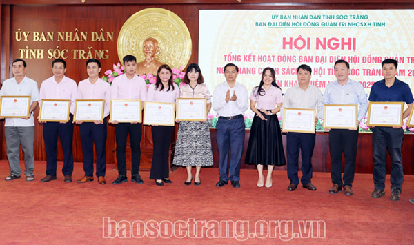 Nhân dịp này, Ban đại diện HĐQT chi nhánh NHCSXH tỉnh Sóc Trăng tặng Bằng khen của Chủ tịch UBND tỉnh và Giấy khen của Chủ tịch HĐQT NHCSXH cho 5 tập thể và 20 cá nhân đã có nhiều đóng góp tích cực trong thực hiện tín dụng chính sách xã hội năm 2024.
