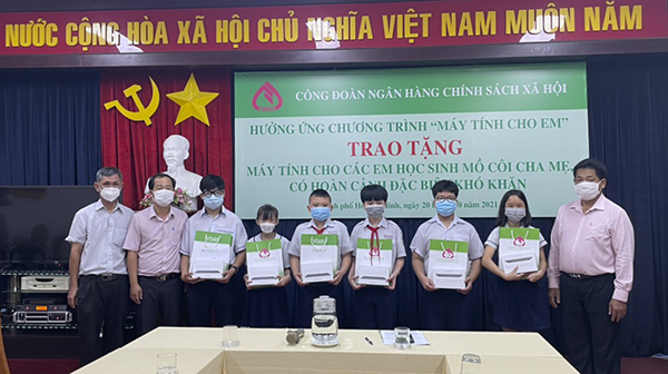 Với tinh thần đó, 500 bộ máy tính (trị giá 5 triệu đồng/bộ) đã được Công đoàn NHCSXH trao tặng cho các em học sinh mồ côi và các Lá chưa lành, là những em nằm trong Chương trình “Cặp lá yêu thương” của Đài Truyền hình Việt Nam, Bộ Lao động, Thương binh - Xã hội và NHCSXH đồng phối hợp tổ chức tại 63 tỉnh, thành phố. Trong đó, ưu tiên trao tặng máy tính cho các Lá chưa lành mồ côi cả cha lẫn mẹ, mồ côi cha hoặc mẹ do dịch bệnh COVID-19, có hoàn cảnh đặc biệt khó khăn.