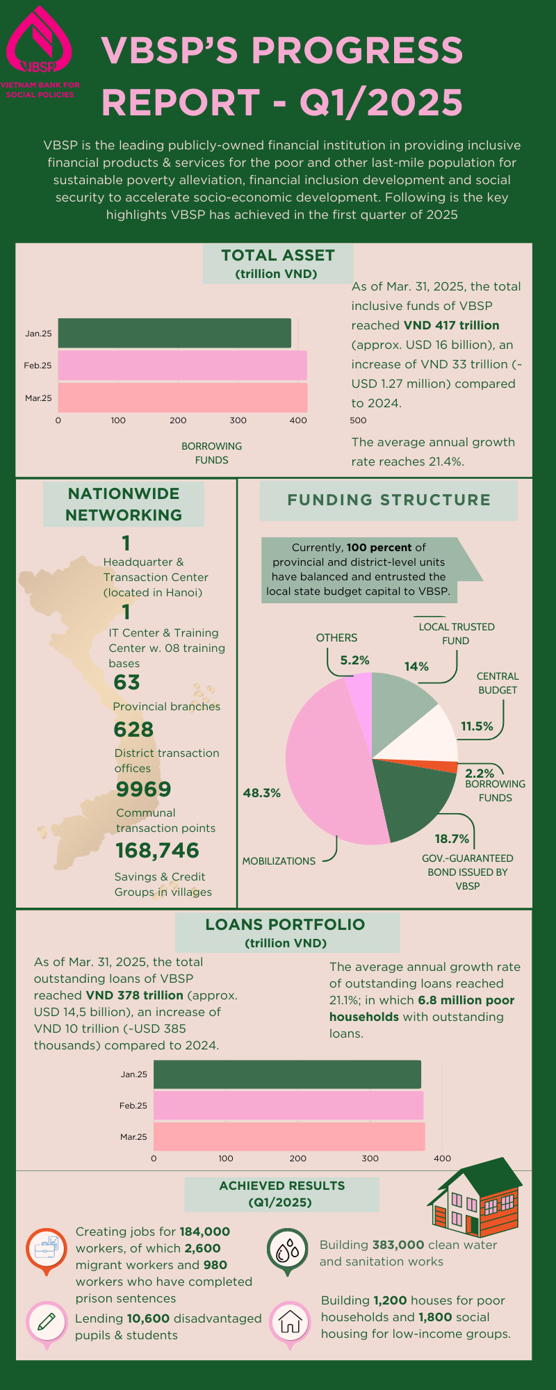 As of Apr. 28, 2025, the total outstanding loans of VBSP reached VND 386 trillion (approx. USD 14,9 billion), an increase of VND 18,8 trillion (~USD 723 million) compared to the end of 2024, in which, the total outstanding loan for social housing were VND 10,3 trillion (~USD 397 million), taking account of 2.66% of the total loan portfolio of the whole system. In the first 03 months of 2025, the credit growth of social housings' loan schemes have supported the construction of more than 1,200 residential dwellings for the poor and 1,800 social housings for low-income groups.