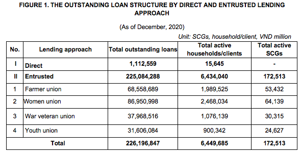 The collaboration/mentor model with SCGs and local mass organizations in social policy credit conduction has contributed to cut down on transaction costs with a large number of micro-loan customers while the number of staff is limited as regulated, bringing about effective and efficient loan disbursement, repayment and quality.