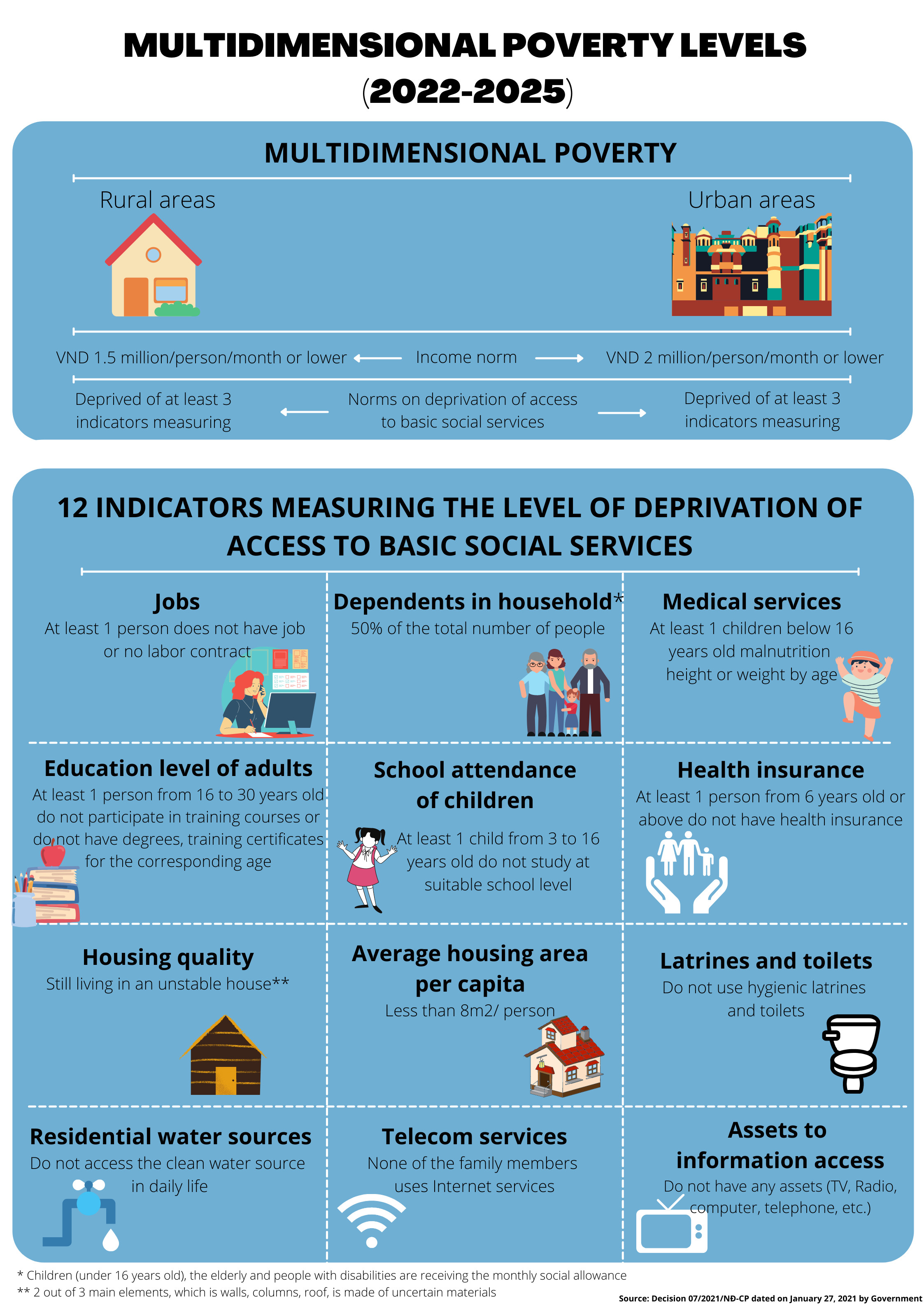 (VBSP News) During 2022 -2025, Vietnam will apply the new promulgating multidimensional poverty levels according to Decision 07/2021/NĐ-CP of Government. This Decision will take effect on March 15, 2021.