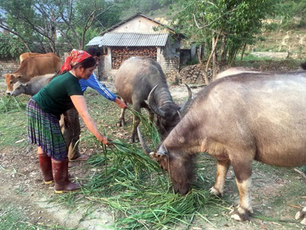 Ms. Mua Thi May in Sa De Phin commune, Lai Chau province is feeding her cattle which is her properties developed from VBSP’s loans